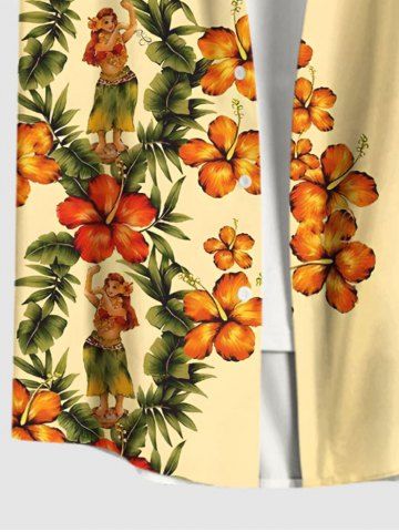 Short Sleeves Shirts > Plus Size Tropical Leaves Floral Hula Dancer Print Hawaii Button Pocket Shirt For Men