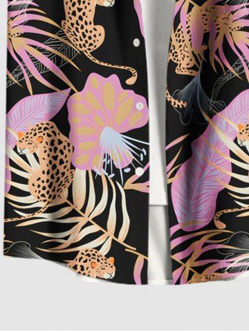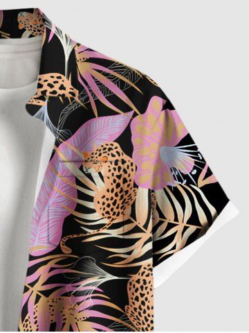 Plus Size Tropical Leaves Floral Leopard Print Hawaii Button Pocket Shirt For Men - Black - L