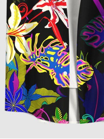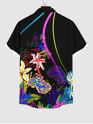 Plus Size Tropical Leaves Floral Light Beam Print Hawaii Button Pocket Shirt For Men - Black - M