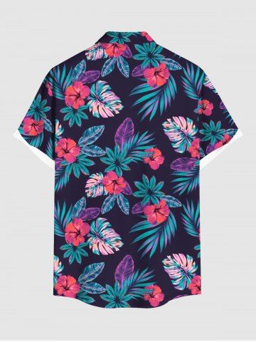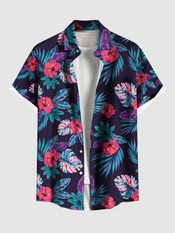 Plus Size Tropical Leaves Floral Print Hawaii Button Pocket Shirt For Men - Black - M