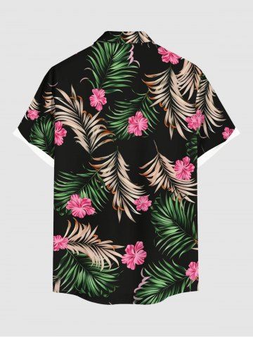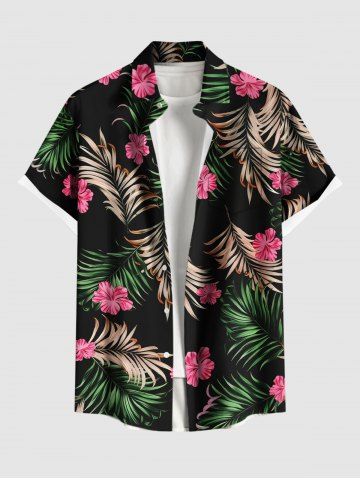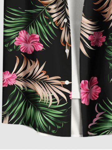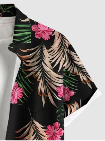 Plus Size Tropical Leaves Floral Print Hawaii Button Pocket Shirt For Men - Black - 4xl
