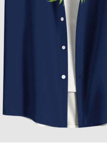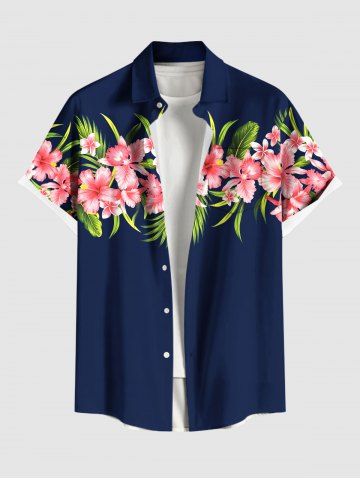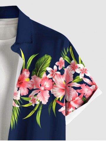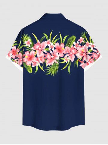 Plus Size Tropical Leaf Hibiscus Flower Print Hawaii Button Pocket Shirt For Men - Midnight Blue - Xl