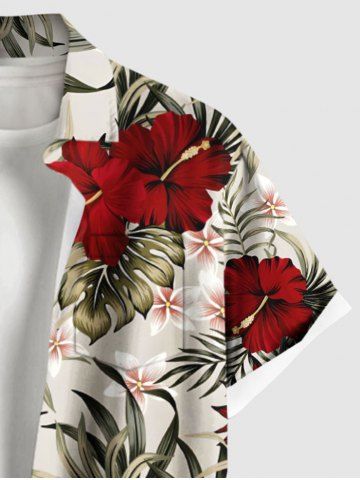 Plus Size Tropical Leaves Hibiscus Floral Print Hawaii Button Pocket Shirt For Men - Red - L
