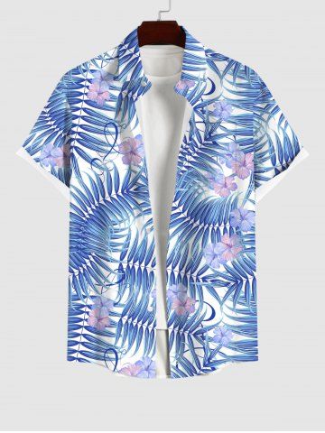 Plus Size Tropical Palm Leaf Flower Print Buttons Pocket Hawaii Shirt For Men - Light Blue - M