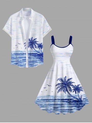 Tropical Sea Coconut Tree Seagull Cloud Print Plus Size Matching Hawaii Beach Outfit For Couples