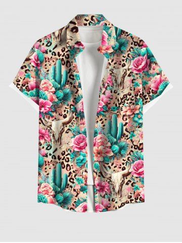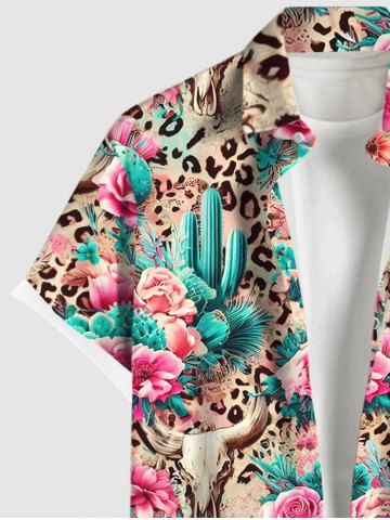 Plus Size Turn-down Collar Cow Head Flower Cactus Leopard Print Button Pocket Hawaii Shirt For Men - Multi-a - S