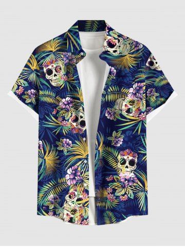 Hawaii Plus Size Turn-down Collar Skulls Coconut Tree Leaf Flower Print Button Pocket Shirt For Men - Deep Blue - L