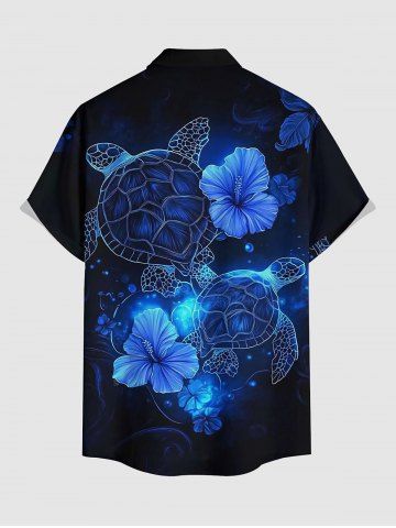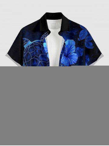 Plus Size Turtle Hibiscus Flowers Print Buttons Pocket Hawaii Shirt For Men - Deep Blue - L