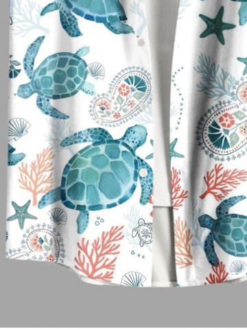 Plus Size Turtle Paisley Flowers Leaf Starfish Print Buttons Pocket Hawaii Shirt For Men - White - Xl