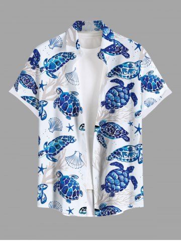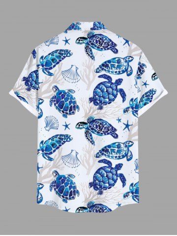 Plus Size Turtle Shell Starfish Coral Plant Print Hawaii Sea Creatures Button Pocket Shirt For Men - Blue - M