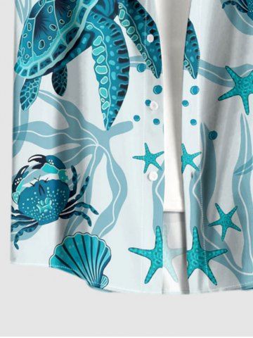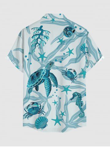Plus Size Turtle Starfish Shell Crab Sea Horse Print Buttons Pocket Hawaii Shirt For Men - Peacock Blue - 4xl