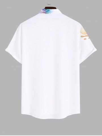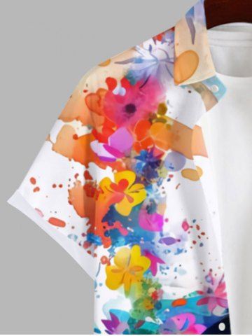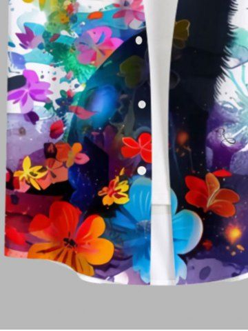 Plus Size Watercolor Floral Ink Painting Cat Print Hawaii Button Pocket Shirt For Men - White - 3xl