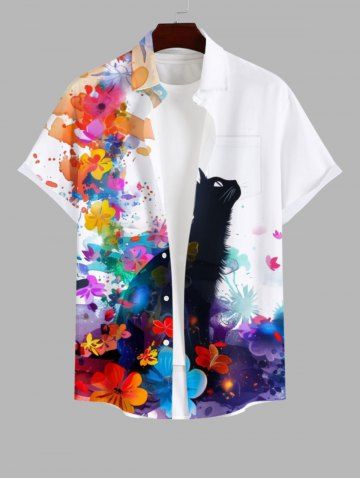 Short Sleeves Shirts > Plus Size Watercolor Floral Ink Painting Cat Print Hawaii Button Pocket Shirt For Men