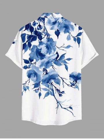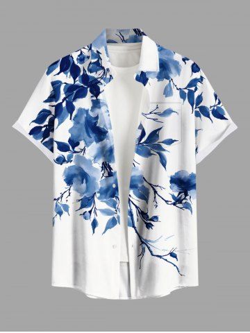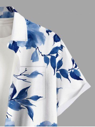 Plus Size Watercolor Flowers Leaf Print Buttons Pocket Hawaii Shirt For Men - Blue - 6xl