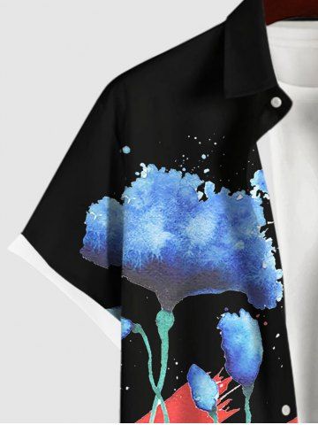 Plus Size Watercolor Ombre Floral Striped Painting Patriotic American Flag Print Button Pocket Shirt For Men - Black - L