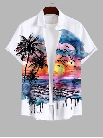 Short Sleeves Shirts > Plus Size Watercolor Sea Coconut Tree Sun Cloud Bird Print Buttons Pocket Hawaii Shirt For Men