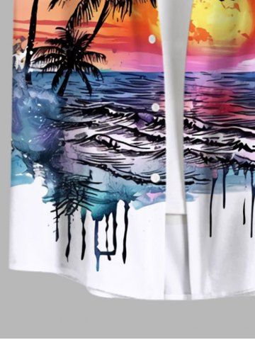 Plus Size Watercolor Sea Coconut Tree Sun Cloud Bird Print Buttons Pocket Hawaii Shirt For Men - Multi-a - 2xl