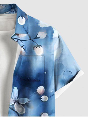 Plus Size Watercolor Tie Dye Ombre Flower Branch Print Hawaii Buttons Pocket Shirt For Men - Blue - M