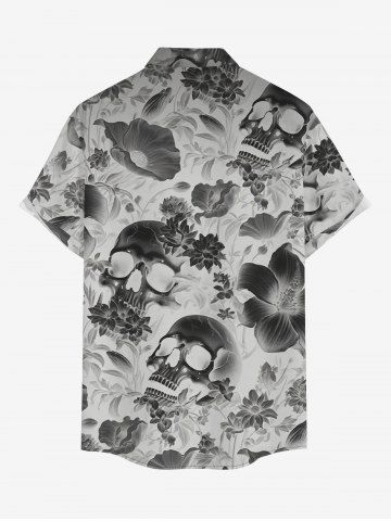 Plus Size X-ray Skull Flowers Leaf Print Buttons Pocket Hawaii Shirt For Men - Light Gray - 3xl