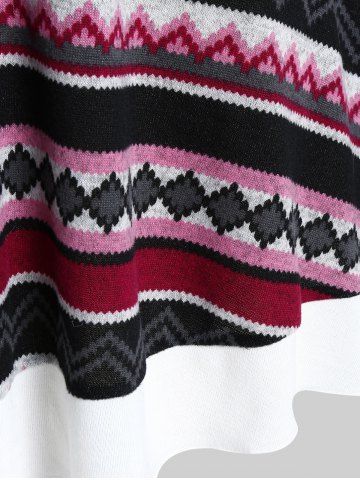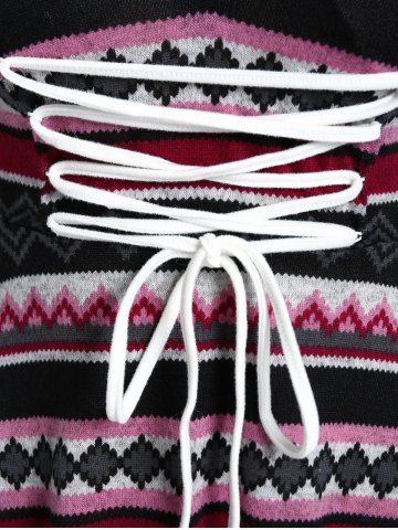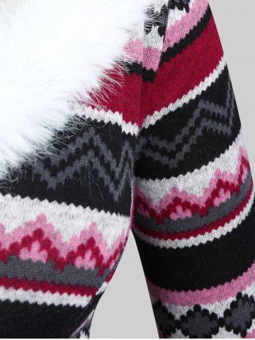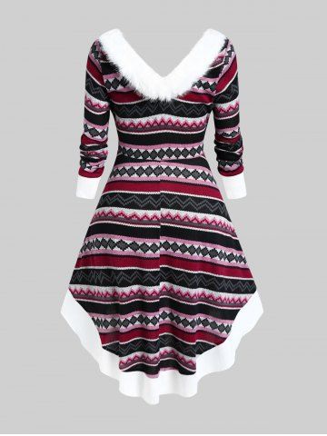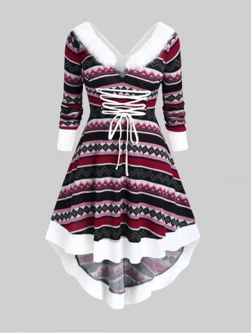 m*****m4Plus Size Faux Fur Trim Colorful Geometric Pattern Lace-up Knit High Low DressColor: MULTI Size: 2X | US 18-20This material isn't as slinky and stretchy as some dresses, so make sure you're paying extra attention to measurements when ordering. That said, I am happy with the overall fit, and the colors and pattern are so pretty. The fuzzy collar is fun. Minus one star because the hem inside the V of the neck flips up all the time and is a little wonky. I have to keep tucking it back inside, meaning I constantly have to stick my hand in my cleavage to fix it.