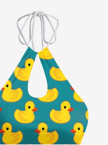 Ducks Print Drawstring Tie Holoow Out Panel Tankini Swimsuit - Green - L