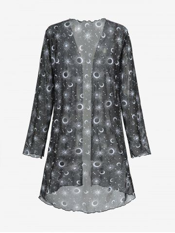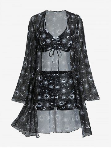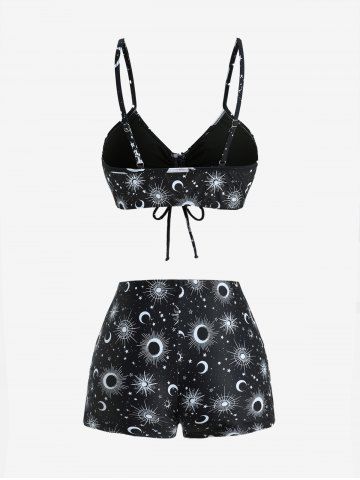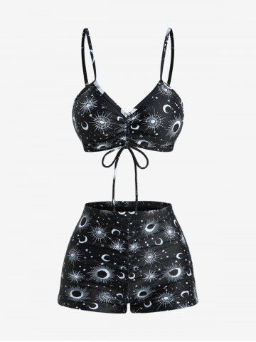 Moon SunStar Print Cinched Ruched Boysleg Tankini Swimsuit With Mesh Cover - Black - Xxl