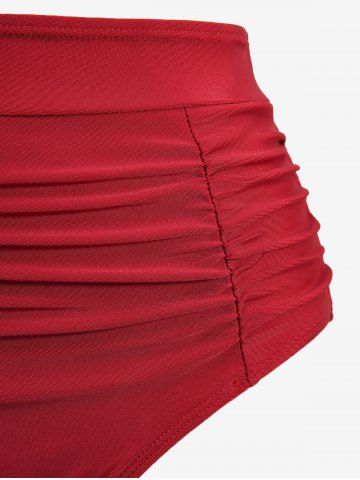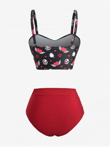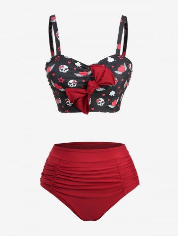 Skulls Heart Stars Print Ruched Bowknot Tankini Swimsuit - Red - Xxxl