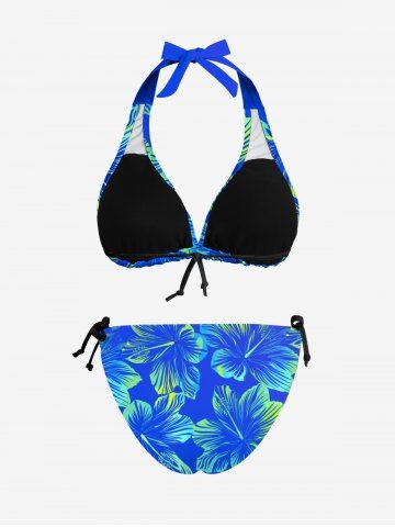 Tropical Hibiscus Flower Print Cinched Tie Halter Hawaii Bikini Set - Sky Blue - 2xl