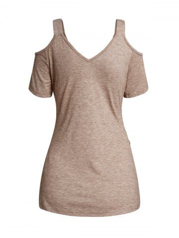 Cold Shoulder Crossover Mock Button Ruched V Neck Buckle Strap T-shirt - Light Coffee - M