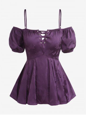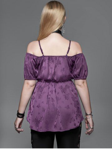 Gothic Floral Butterfly Embroidery Lace Up Cold Shoulder Top - Purple - 2x | Us 18-20