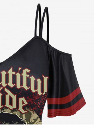 s*****15Gothic Floral Skull Print Cold Shoulder TopColor: BLACK Size: 5X | US 30-32Love the design and stretchy material. Just wish they made shirts longer so it would fully cover my tummy!!!