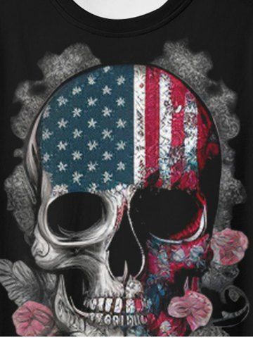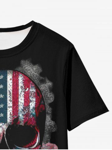 Gothic Patriotic American Flag Skull Rose Print T-shirt - Black - M