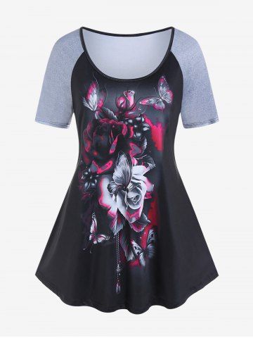 Gothic Rose Butterfly Printed Raglan Sleeves Tee - Black - 1x | Us 14-16
