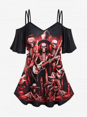 Gothic Skeleton Guitar Bloody Print Cold Shoulder Cami T-shirt - Black - 1x