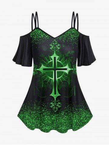 L*****e5Gothic St Patrick's Day Butterfly Cross Print Cold Shoulder TopColor: BLACK Size: L | US 12Absolutely love this shirt! the colors, the length, the softness. It fits amazingly, and the cold shoulder gives me the feeling of wearing a tank top, but with a partial sleeve. I love this shirt so much!