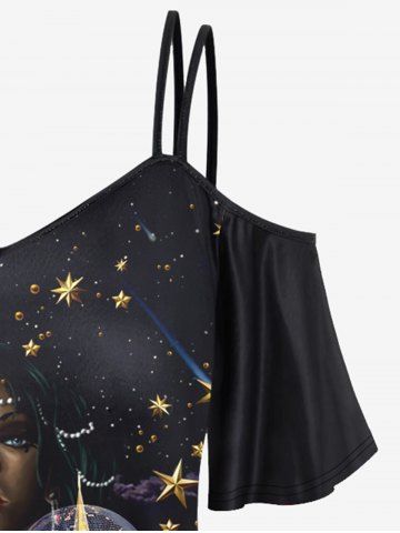 Gothic Wizard Galaxy Moon Star Glitter Print Cold Shoulder Cami T-shirt - Black - L