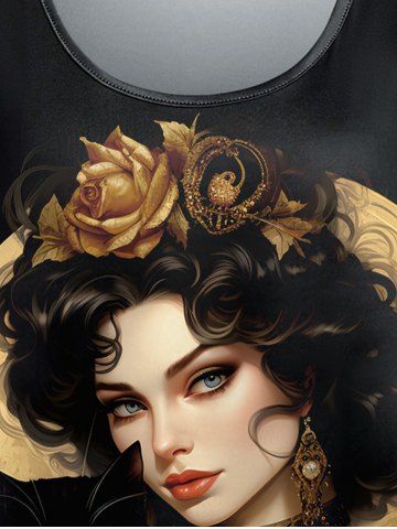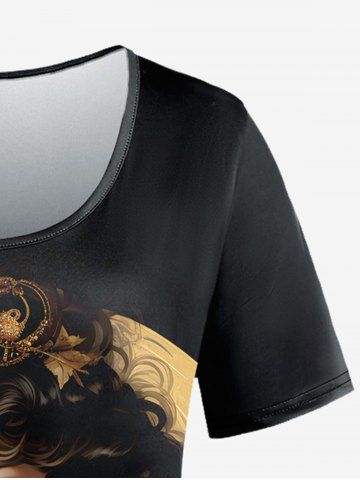 Gothic Woman Flower Cat Print Short Sleeves T-shirt - Black - 2x