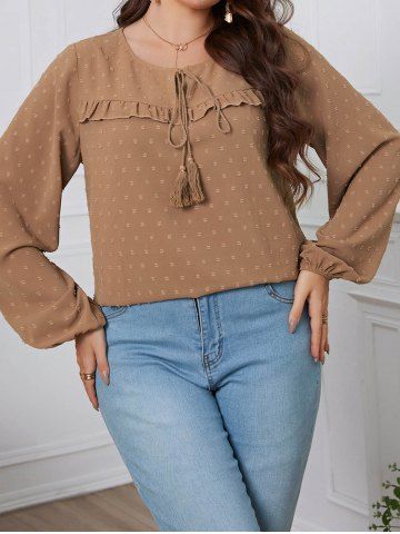 Plus Size Swiss Dots Plain Color Tied Tassel Round Neck Long Sleeve Blouse - Light Coffee - 1xl