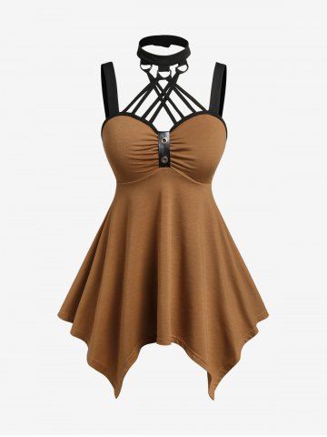 n*****85Gothic Halter Crisscross Strappy Handkerchief Hem D-ring Tank TopColor: COFFEE Size: 1X | US 14-16Je m'attendais plus à une matière en simili cuir (c'est en coton) mais il me plaît énormément quand même, taille fidèle aux exemples