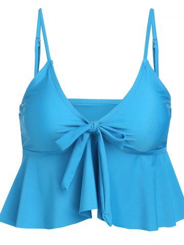Beach Leaf Floral Print Bowknot Ruffle Tankini Swimwear - Blue - L