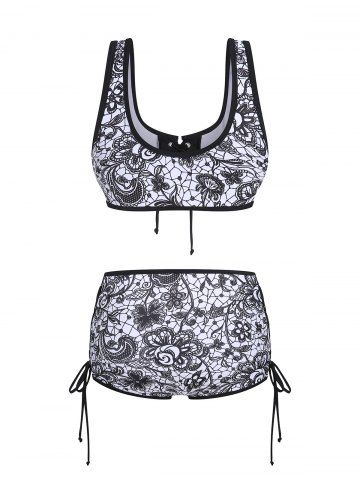 Bohemian Floral Paisley Print Lace Up Tankini Swimwear - Black - L