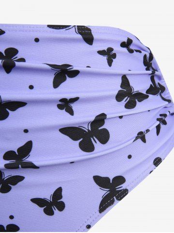 Butterfly Print Bowknot Crisscross Straps Cinched Tankini Swimsuit - Purple - M