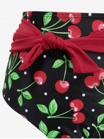 Cherry Print Tied Plunging Halter Backless Tankini Swimsuit - Red - L