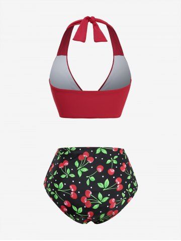 Cherry Print Tied Plunging Halter Backless Tankini Swimsuit - Red - Xxl