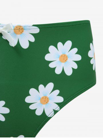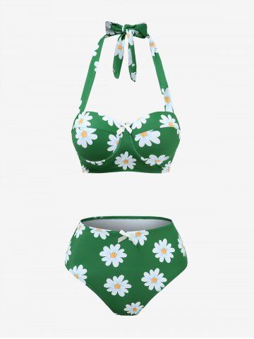 Daisy Flowers Print Bowknot Halter Tankini Swimsuit - Green - Xxxl