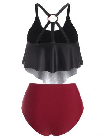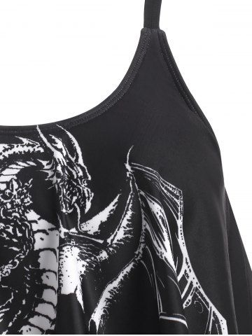 Dragon Print O Ring Strappy Ruched Tankini Swimwear - Black - Xl