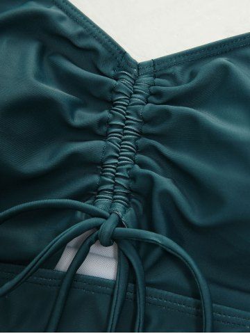 Flower Leaf Print Cinched Boyleg Tankini Swimsuit (Adjustable Shoulder Strap) - Green - M