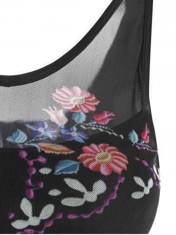 Flower Print Mesh Panel Tankini Swimsuit - Black - Xxl