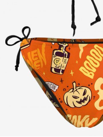 Halloween Pumpkin Ghost Bottles Letters Print Halter Cinched Bikini Set - Orange - Xs