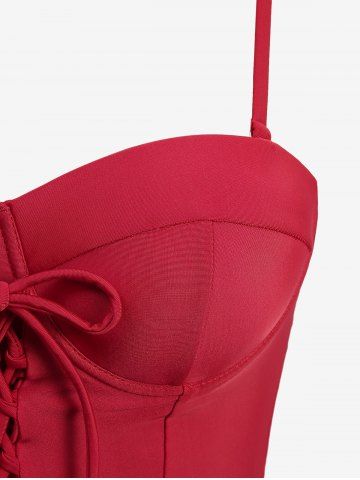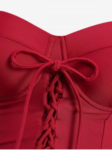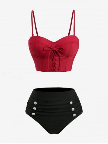 Lace Up Bowknot Tie Ruched Buttons Bottom Tankini Swimsuit - Red - Xxl
